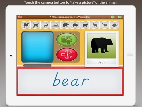 Each animal is first presented by their silhouette. When the camera button is touched an actual photograph of the animal appears on the screen. The child will learn to identify the unique shape of each animal.
