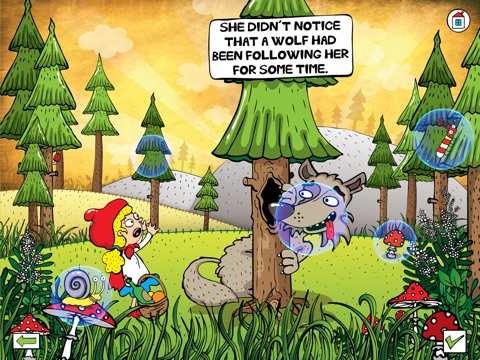 You can decide if you want to listen to the narrator, while your children explore the forest and grandmother´s cottage. Another possibility is to read the interactive book together with your children. The texts in comic balloons will takes you through the story. There are highlighted areas for childrens restless fingers and vivid imagination. All objects in the scenes are beautifully animated and accompanied by sound. It is amusing to touch the individual parts of the picture.