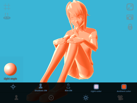 - Controls for shadow, rim light, main light color, ambient light color and background color.
