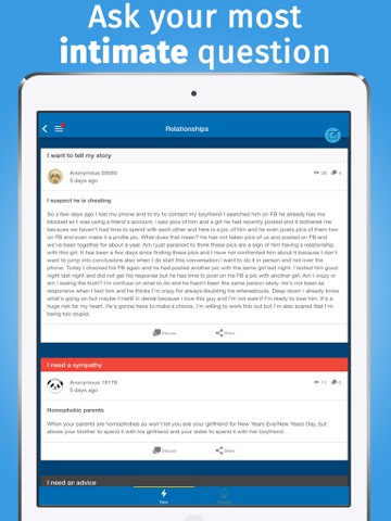 We are a social service of anonymous Q&A about personal life. You can discuss the most delicate and private issues confidentially. Friendly community will provide emotional support and advice.
