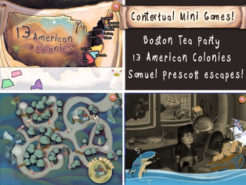 Mini-games explain concepts such as Boston Tea Party and No Taxation without Representation; 13 colonies jigsaw and “Help Samuel Prescott Escape” maze provide additional context