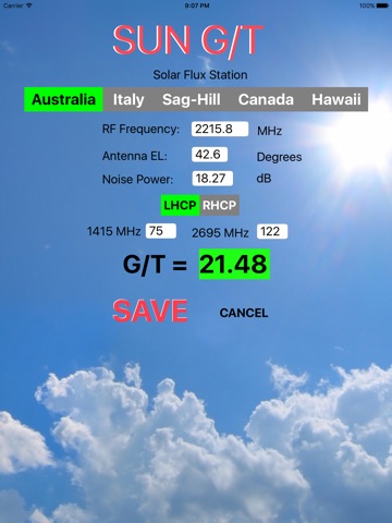 This application provides the ability to compute the performance (aka figure of merit) of a parabolic reflector antenna. To use this app you will need to measure the noise produced (dB above cold sky noise) by the Sun at the desired radio frequency. To compute results please enter: Antenna Site location; Antenna ID; Antenna Size; Antenna configuration; Polarization of test; Frequency of test; and Antenna elevation. The application will then go and automatically get the most current solar flux to calculate the results. The application then computes the results and stores multiple result runs in a log that can be emailed to yourself or others.