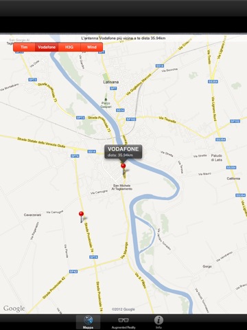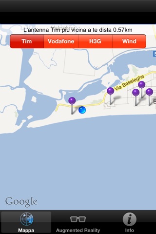 - visualizzazione su mappa della posizione di tutte le antenne di telefonia presenti in Veneto (differenziate per gestore) e la distanza di ognuna di esse dalla tua posizione attuale;