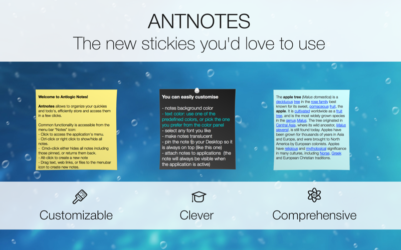 Antnotes ist sehr hilfreich, um sich ein paar schnelle kleine Notizen zu machen. Ich nutze es, um alle echten Papierzettel von meinem Schreibtisch zu verbannen. Stattdessen „lebt“ Antnotes halbtransparent in einer Ecke meines Monitor-Schreibtisches. Dort stört es nicht. Ich kann aber jederzeit draufklicken, um meine Notizen zu lesen oder um eine neue hinzuzufügen. Schon eine Antnote ersetzt einen ganzen Zettelstapel. Das Programm kann aber noch viel mehr! Wirklich hilfreich – danke!