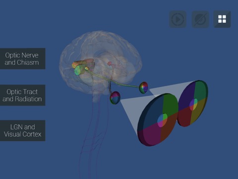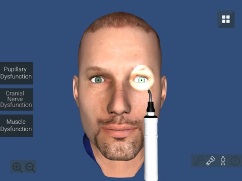 The interactive eye examination enables a user to explore pupillary, ocular motility, and cranial nerve dysfunctions in a virtual patient. A visual pathway simulator enables the user to explore how brain damage impacts a patient’s vision.