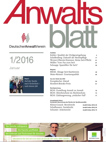 Das Anwaltsblatt ist das offizielle Organ des Deutschen Anwaltvereins. Anwälte informieren Anwälte über aktuelle Entwicklungen in allen Rechtsgebieten. Schwerpunkte sind Anwaltsrecht, Anwaltshaftung, Anwaltsvergütung und