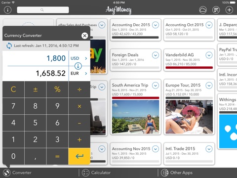 AnyMoney comes with an easy to use and elegant currency converter and a handy calculator.