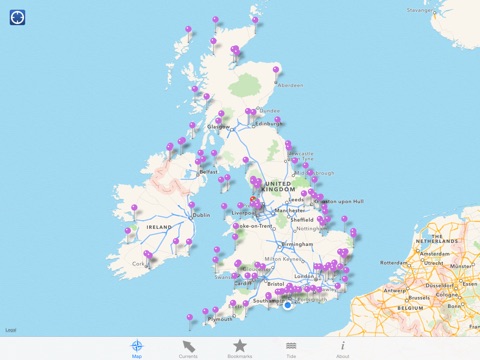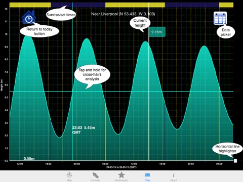 The model, based on a 1.8-km grid (UK only) or 7-km (Rest of the World), are a novel feature of the App and allow users to obtain tide predictions in a much wider range of locations (e.g., in areas away from ports with tide gauges) and ‘fill in the gaps’ between observation points. Using the App, you are able to get tidal predictions for known ports and observation points around the world. You are also able to obtain predictions for points not covered by port data, which are calculated by the tidal model. Frequently used locations can be bookmarked for ease of access.