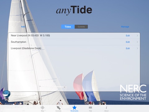anyTide is a mobile app for tidal height and current predictions created by the National Oceanography Centre. The App provides tidal predictions around the world.