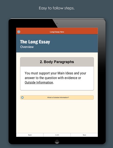 AP Hero has specifically customized the AP US History Long Essay App for the new 2015 AP Exam. The Long Essay is the last part of the AP US History Exam although it is also a brand new type of essay for the 2015 exam. AP Hero will walk you through the steps of how to answer the Long Essay as well as give you direction on what types of questions you can expect to see on the AP US History Exam. With this simple and easy to understand app you will be on your way to getting a 5 on the AP US History Exam!