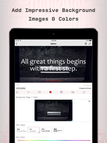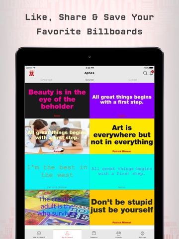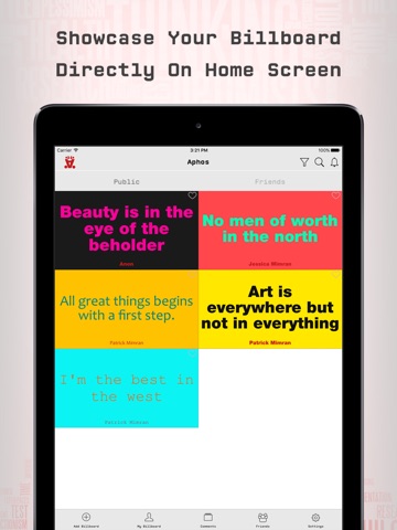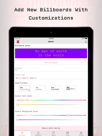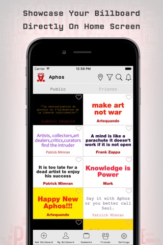 We bring you Aphos, which is an app inspired by Patrick Mimran’s Billboard project. The project started almost a decade ago in the Chelsea art district of New York, and in other locations around the world. This app allows users to create their own billboard, using life quotes, aphorisms, sarcasms or art and publish it for their followers or the public to see.