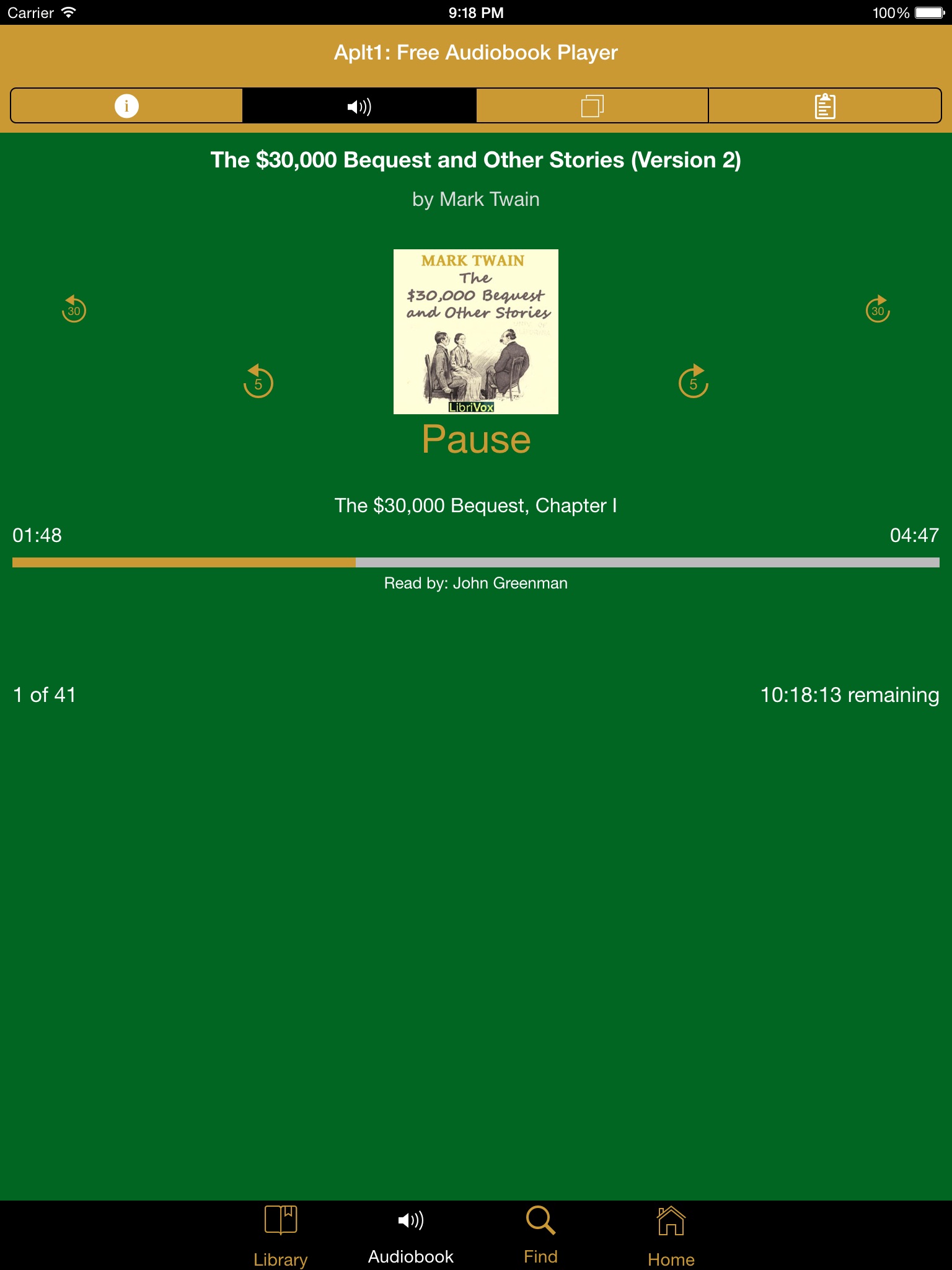 Aplt1™ ("app-let-one") provides a better way to enjoy free audiobooks from LibriVox, or any other unprotected mp3 audio book that is available via RSS.
