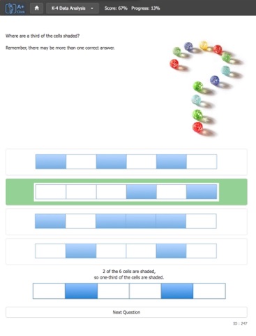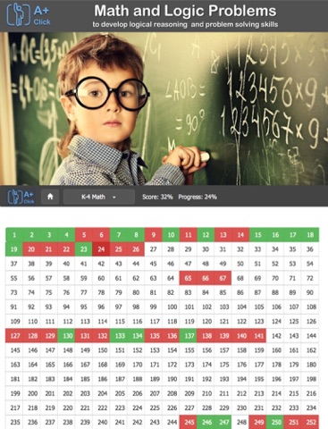 A+ Click introduces math to fourth graders. The app features a set of 430+ challenging problems with the answers for kids in grade four. The questions are based on the Common Core Standards in Math and go beyond by adding hundreds of meaningful practical problems and puzzles. The questions concentrate on understanding, spatial reasoning, usefulness, and problem solving rather than math rules and theorems. The problems include a short description and an illustration to help problem solvers visualize the model. The problems can be solved within one minute. The questions are sorted by 6 themes: arithmetic, algebra, geometry, data analysis, word problems and logic, and applied math. The problems are part of the free website www.aplusclick.com