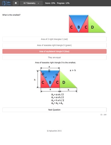 A+ Click K7 Math for students in seventh grade is self-study app. The app features a set of 500+ challenging problems with the answers. The questions are based on the Common Core Standards in Math and go beyond by adding hundreds of meaningful practical problems and puzzles. The questions concentrate on understanding, spatial reasoning, usefulness, and problem solving rather than math rules and theorems. The problems include a short description and an illustration to help problem solvers visualize the model. The problems can be solved within one minute. The questions are sorted by 6 themes: arithmetic, algebra, geometry, data analysis, word problems and logic, and applied math. The problems are part of the free website www.aplusclick.com
