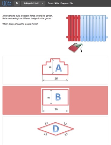 A+ Click K8 Math for students in grade 8 is self-study app. The app features a set of 570+ challenging problems with the answers. The questions are based on the Common Core Standards in Math and go beyond by adding hundreds of meaningful practical problems and puzzles. The questions concentrate on understanding, spatial reasoning, usefulness, and problem solving rather than math rules and theorems. The problems include a short description and an illustration to help problem solvers visualize the model. The problems can be solved within one minute. The questions are sorted by 6 themes: arithmetics, algebra, geometry, data analysis, word problems and logic, and applied math. The problems are part of the free website www.aplusclick.com