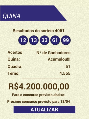 Fique por dentro dos últimos sorteios da loteria da Caixa e da quantidade acumulada para os próximos de maneira fácil e rápida, só precisando de uma conexão com a internet!