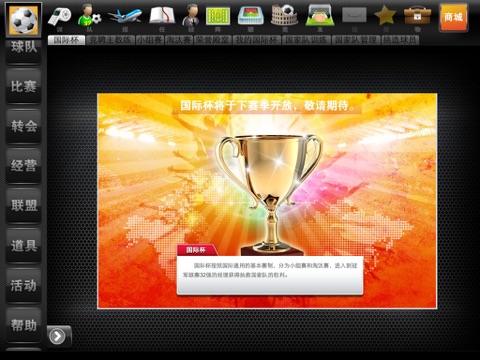 世界杯赛事根据真实足球中规则制定,经过小组赛和淘汰赛等几个阶段进行,你将能够执教国家队!