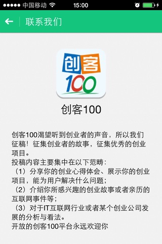 “创客100"客户端是创客100推出的专门为创业者提供创业信息和专业服务的客户端平台。创客100是由《IT时代周刊》发起创立,是一个充分利用互联网思维、专门为创业者提供全面支持的创业平台。 “创客100客户端”共设置五个栏目,分别是“创业资讯”、“投融资”、“项目库”、“投资人库”、“创业下午茶”。
