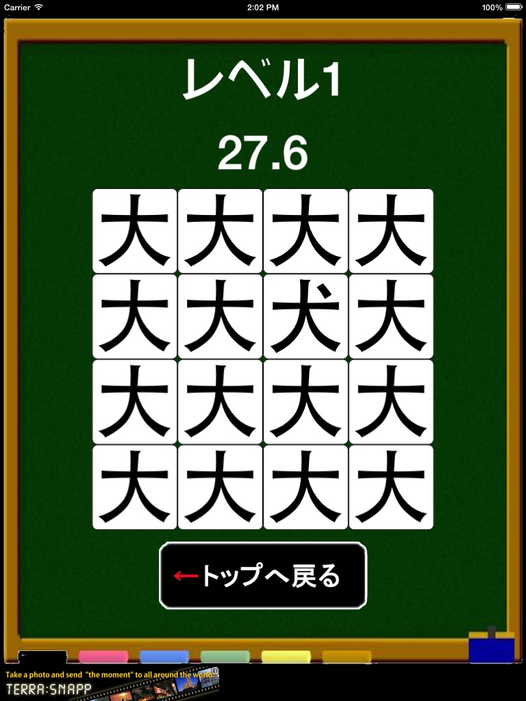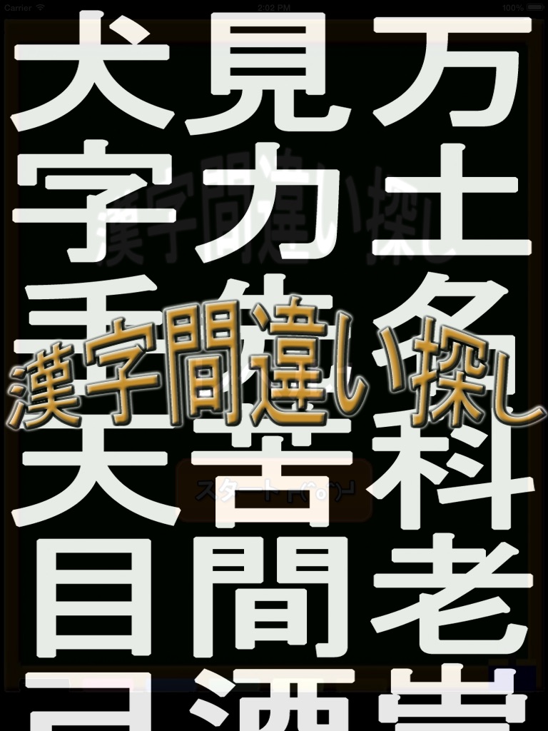 並んでいる漢字の中に一つだけ紛れている別の漢字を、規定秒数以内にできるだけ早く見つけてください。