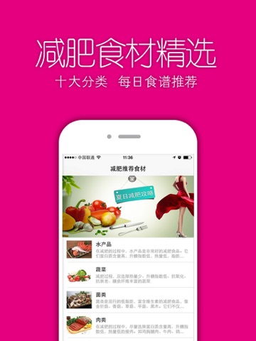 共分为了水产品、蔬菜、菌类、肉类、谷物主食、豆类、水果、奶制品、蛋类、烹调油等十个大项,让您迅速找到喜爱的食材及相应的减肥食谱,避免了您大海捞针的烦恼。