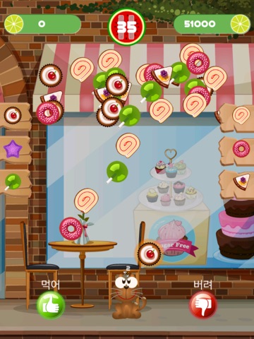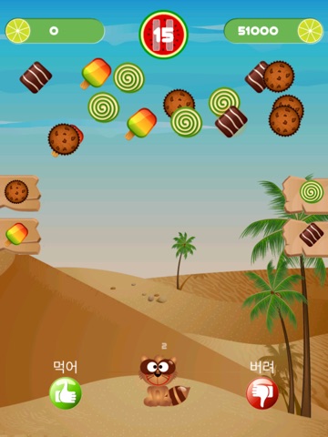 먹거리가 내려오면 왼쪽먹거리에 해당하면 먹어를 터치하고 오른쪽먹거리에 해당하면 버려를 터치하여 마구마구 먹고 버리고 또먹는 게임 입니다.