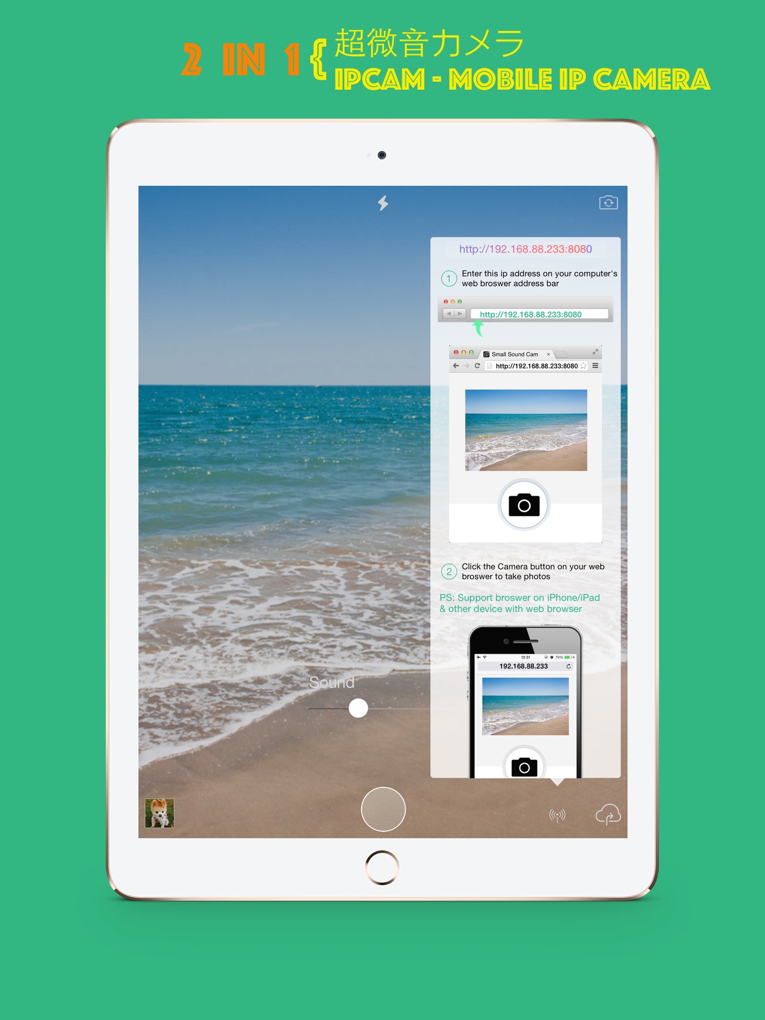 StageCameraHD is a good way for you to take photos with a small shutter sound and the shutter can be control remotely through your web browser ~