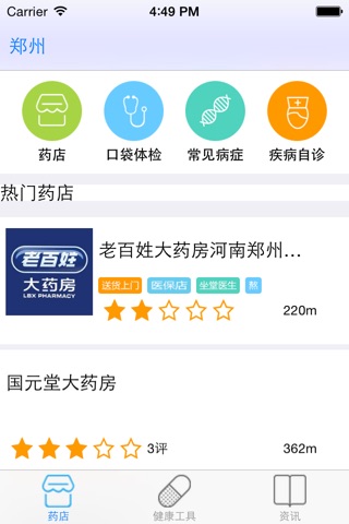 1,此APP是用来查询周边药店,可以通过地图搜到你要找的药店,查询药店一些简单的信息,比如距离自己的位置,星级等。