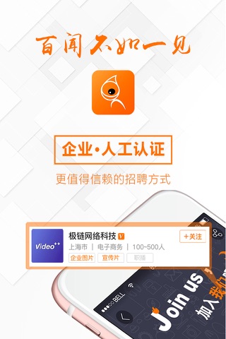整体界面全新改版啦!名企入驻,海量真实职位随时随地等你挑。公司环境视频秀出来,宣讲直播,在线聊,和工作看对眼之后再约~求职更快更真实,招聘高效率,靠谱工作随你选。