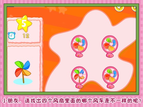 小朋友,根据游戏里左边的提示,在规定的时间里,从右边4个图案里找出与其他3个不同的图案,就是闯关成功哦!找出的时间越短,得到的星星就越多哦!小朋友快来和芭比一起挑战游戏吧!