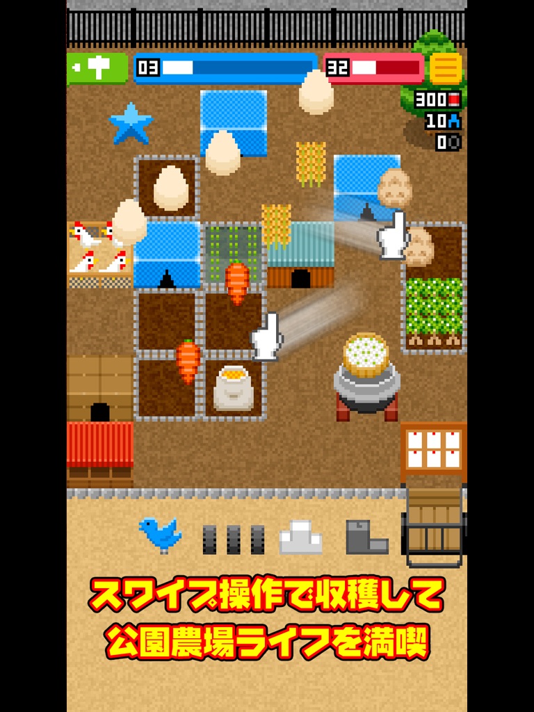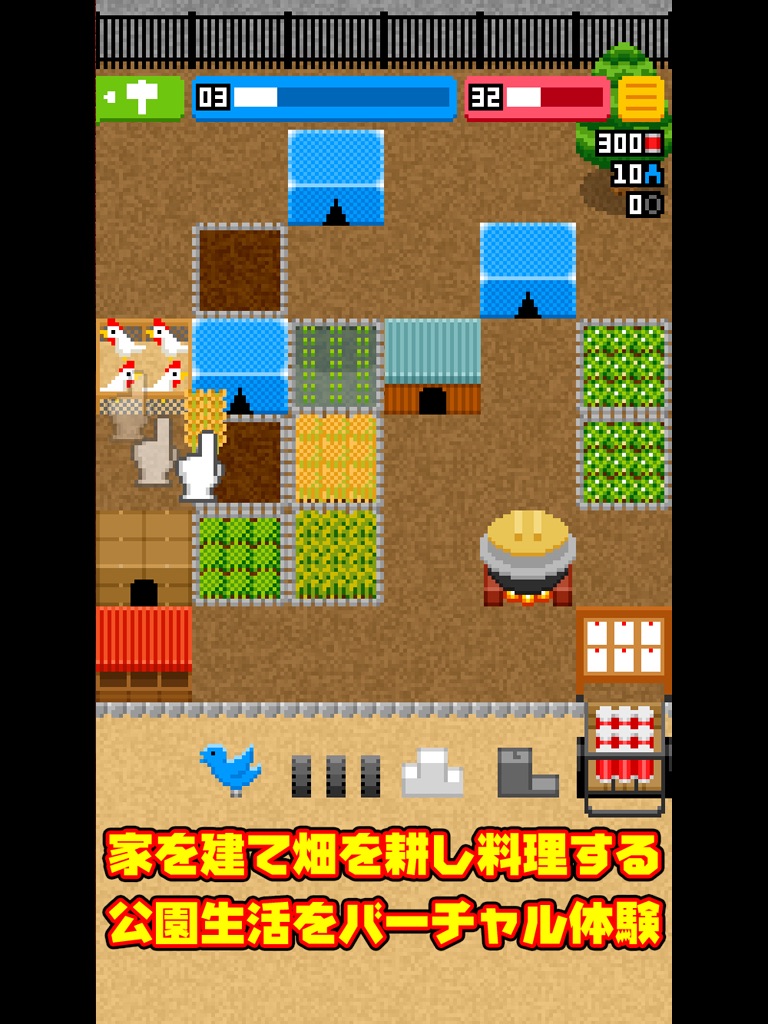 公園の空き地に家を建て、畑を耕し、食材や調理品を販売をする農場ゲームです。
