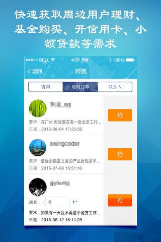 6. 商家版可供理财经理、保险代理人、小贷机构经理、证券销售经理等人士快速便捷获得大量同城用户订单,大幅提高业绩,完成销售目标。