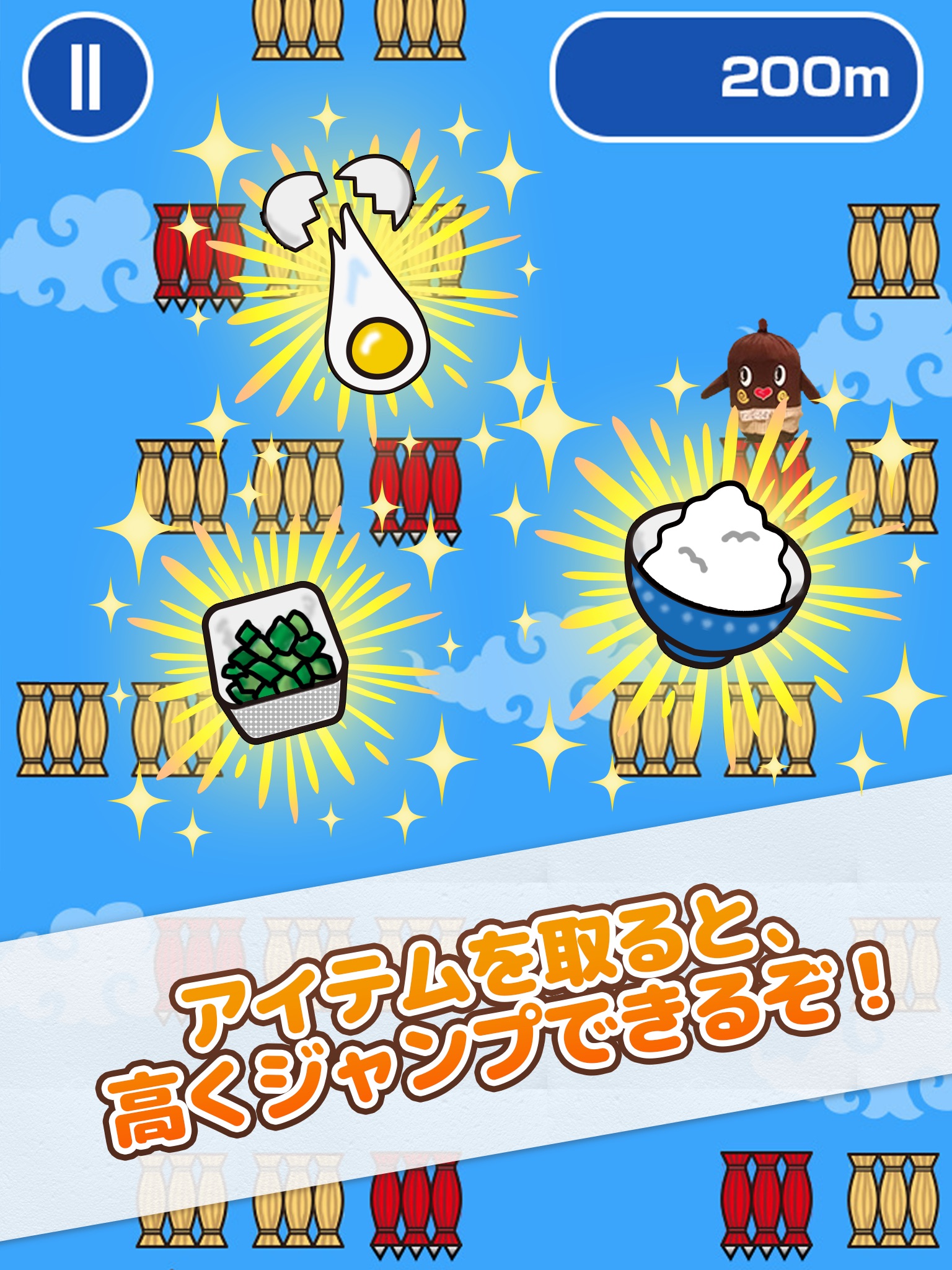トゲ付のワラ納豆を踏んだり、画面の下に落ちてしまうとゲームオーバー!