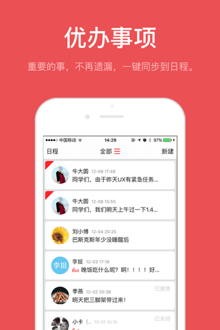 --优办事项:发送优办事项给同事,应用内、短信、语音提醒多重保障事项必达,实时跟踪反馈状态,重要的事不再遗漏。