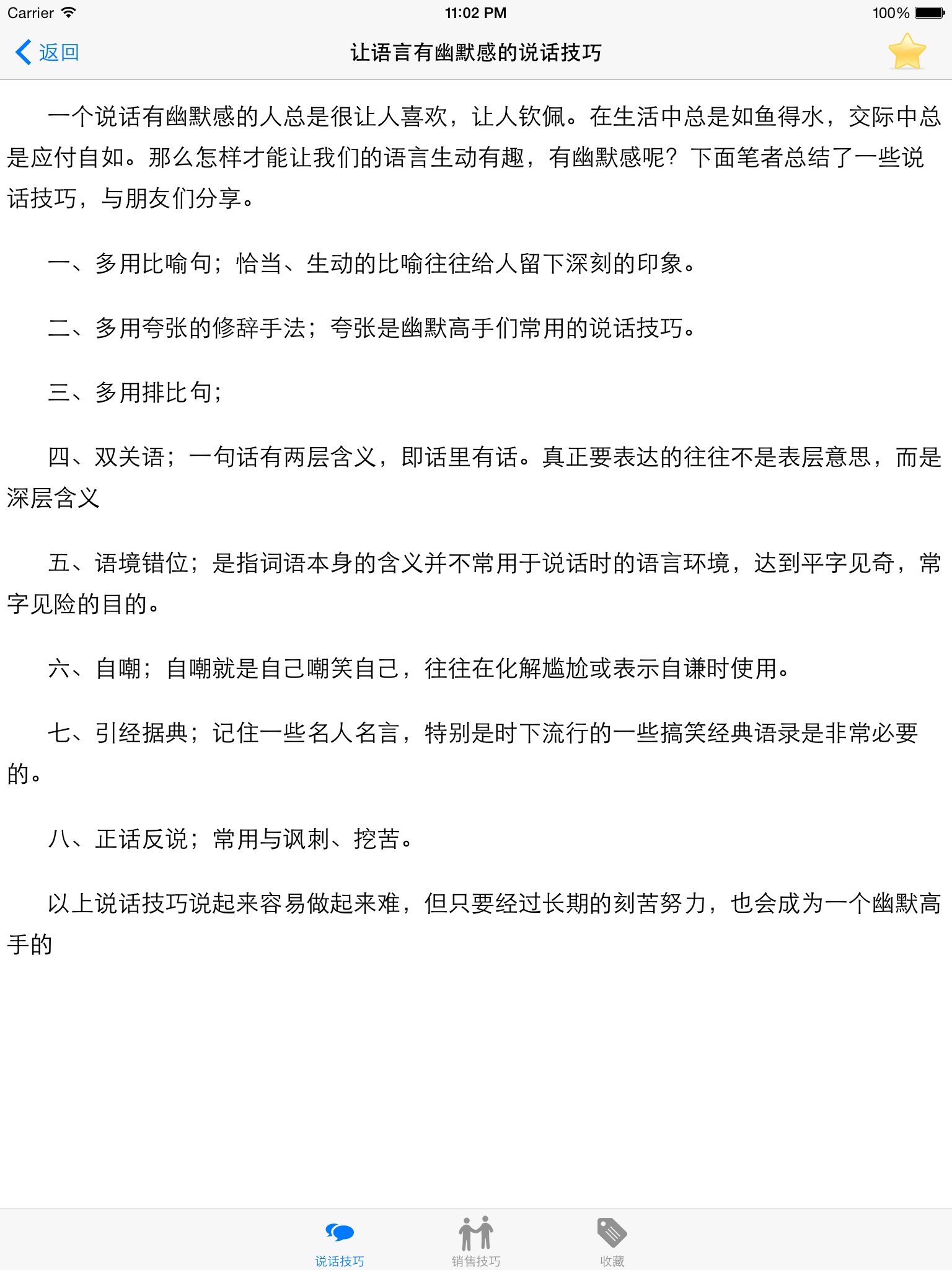 The speech skills of the collection of hundreds of classic speech and sales skills, including the love, work, sales and other aspects of life in the face of communication problems. Let you get rid of the trouble, easy to deal with everything.