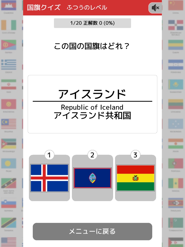 国旗の一覧検索の他、下記のクイズ形式をご用意しております。