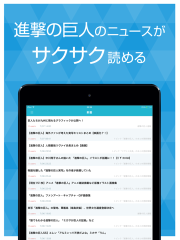各種メディアニュース/コラム/掲示板などさまざまなサイトから配信される進撃の巨人の話題をまとめてチェックできます。