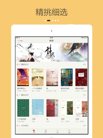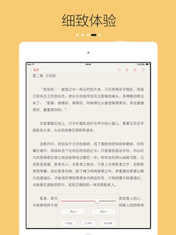 -阅读界面友好,四种背景颜色、字体选择,记忆阅读,智能推荐,左右滑动翻页,封面精美