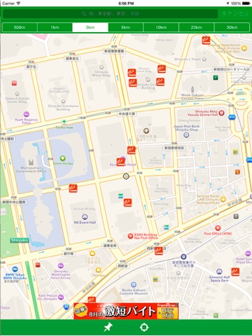 今あなたが居る場所に地図が移動をします。地図は500m~30Kmで表示可能です。