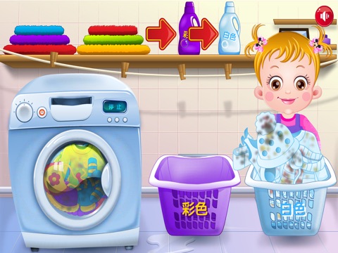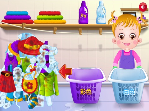 今天妈妈不在家,懂事的宝贝决定自己将脏衣服洗干净,快来帮助她吧!首先,将彩色和白色的衣服分开放,再依次放入洗衣机里,记得不要放错洗衣液哦!