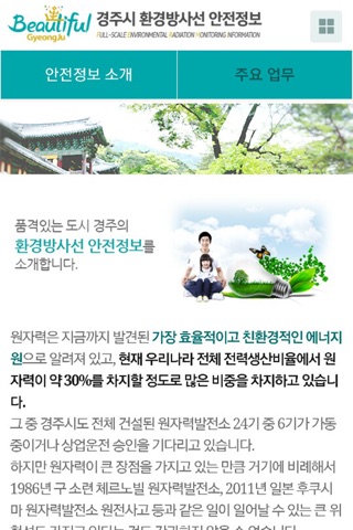 또한 거기에 발 맞추어 주민들께서 좀 더 쉽고 친근하게 다가갈 수 있도록 「경주시 환경방사선 안전정보」 홈페이지 및 앱을 구축하게 되었습니다.