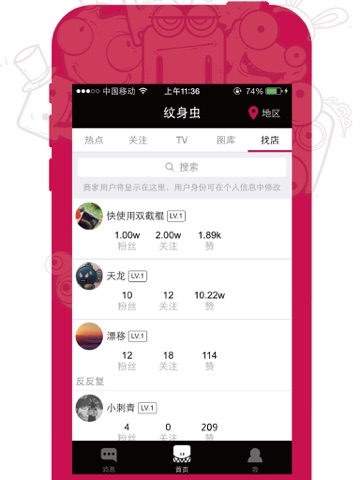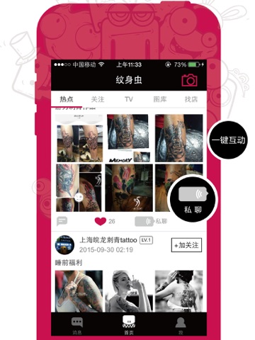 专为纹身爱好者量身定制的交流平台,拥有独特的纹身交流圈、纹身视频tv、海量纹身图库以及最专业的纹身店纹身师和他们作品集,数以万计的文身店、纹身作品以及纹身器材商供你选择,这里有最强 大搜索引擎供你选图。专属爱刺青的你,专业文身APP。海量免费纹身图库,免费纹身师招聘及应聘平台,有万种tattoo designs,刺青师尽情展示才华。还在为找不到专属于自己的纹身店而 担忧么?还在为找到精美的图片而烦恼么?没关系,纹身虫纹讯带你解决一切不可能的可能。
