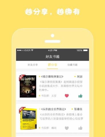 3、每个网友分享几本书,我们身边就会有一个云端超级图书馆,属于我们大家的图书馆。