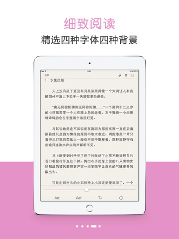 -阅读界面友好,四种背景颜色、字体选择,记忆阅读,智能推荐,左右滑动翻页,封面精美。