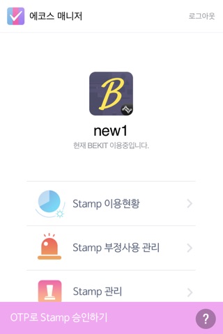 더불어, echoss Stamp 관리, OTP를 통한 승인, 부정사용 control 등의 Stamp 운영을 직접 APP을 통해 처리할 수 있도록 기능을 제공합니다.