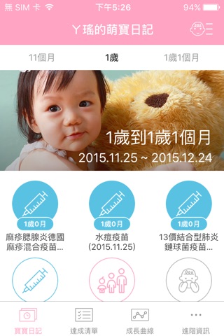 著重寶寶健康及成長紀錄的app,包含寶寶成長過程中的疫苗接種時程以及發展指標,並且充分宣導育兒衛教資訊。