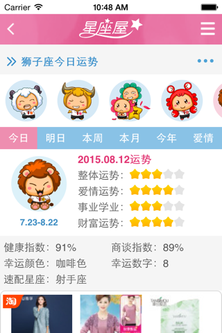◇首页:掌上星座屋给广大用户拥有简洁清新,栏目分明的界面,使用起来能赏心悦目!