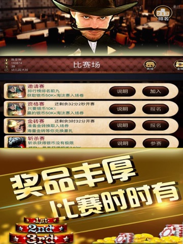 比赛场玩法多重多样,金砖赛、资格赛、季度赛、至尊赛应有尽有,王者加冕获豪礼,来吧,加入豪门德州,亮出您的底牌!