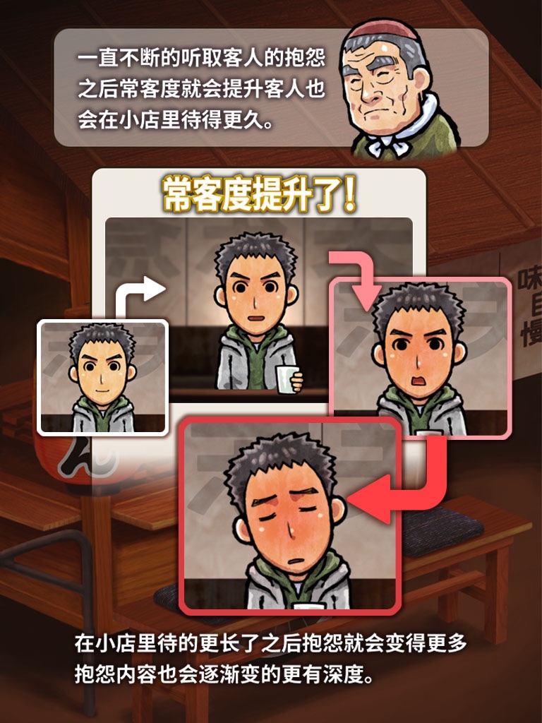 让自己成为一个关东煮小店的顽固老爹进而经营这间关东煮小店的、故事推进式的休闲放置型游戏。