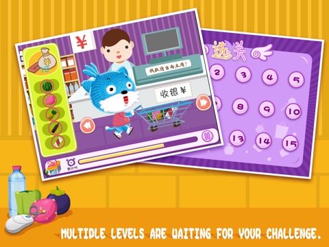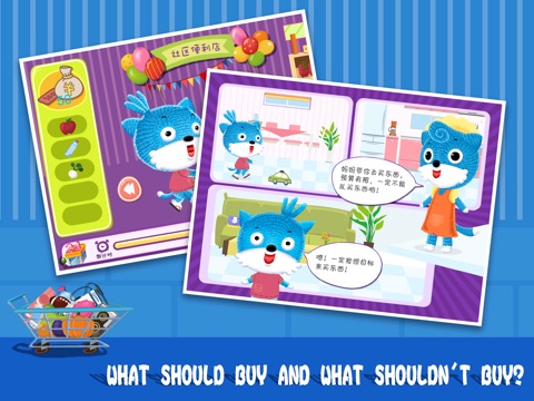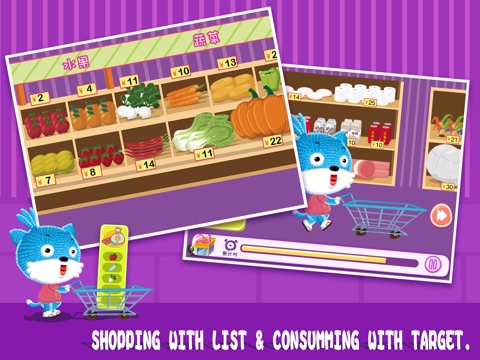 " No chaos shopping" is a shopping simulation game designed for 2-5 year-old babies. Everything is on the shelves of merchandise. Get the trolleys and go shopping with blue cat in the shopping mall to find the target commodities. Complete the products purchasing task with a limited amount to develop your babys self-control and planning capabilities. Let your baby know how to control herself reasonable and develop her a rational consuming awareness!
