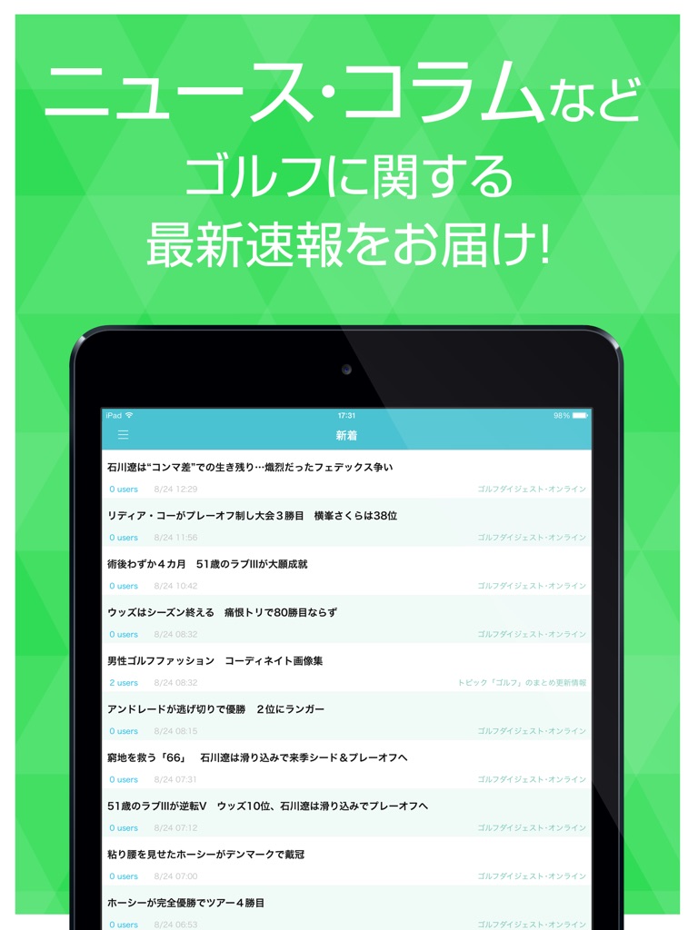 ゴルフに関連するニュースも閲覧できるので、ゴルフ仲間やゴルフの先生との会話のネタ集めにもご活用ください。